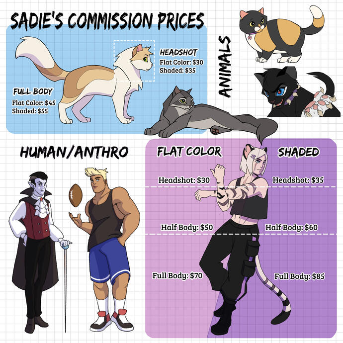 these may not be exact prices, since every commission is unique & i work in a variety of styles. we will work it out after you send me what you want. if i'm out of your budget but you still want to support me, please consider buying me a ko-fi or checking out my redbubble shop!all prices are in USD.